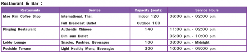 Restaurants & Bar, Function Rooms, Business (Secretarial service/Color, Photocopying/Facsimile transmission/ Wi-Fi internet access/Direct broadband internet access/Personal computers and printers/Flight Confirmation), Tour and travel agent desk, Concierge service, Fitness Centre, Sauna rooms, 20-meter rooftop swimming pool, Traditional Thai massage, Airport transfer service, Limousine and mini-bus service, Postal and parcel service, Foreign exchange, Safe deposit boxes, Room Service 05:00 a.m. – 02:00 a.m.