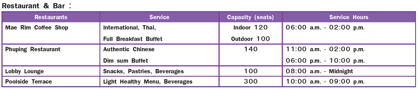 Meeting Rooms : 6 (See page Chiang Mai Orchid Hotel)