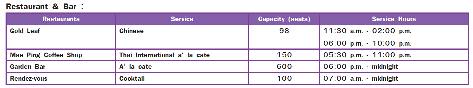 Meeting Rooms : 7 (See page The Imperial Mae Ping Hotel)
