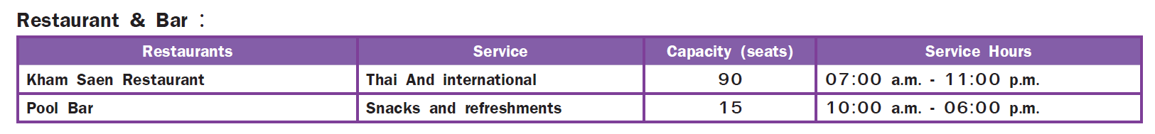Lagoon-shaped swimming pool with water slide and sun terrace, SPA Cenvaree, Fitness Centre with steam rooms and saunas, Children’s playground, Babysitting service available upon request, Complimentary wireless internet access, Tour information desk, Complimentary shuttle service to night markets and Central Festival Chiang Mai shopping and lifestyle Centre, Laundry services