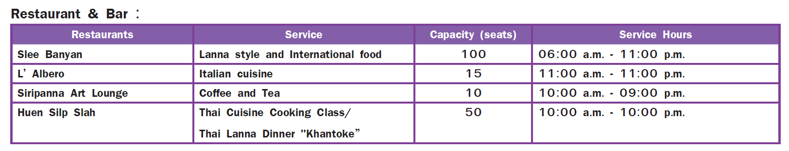 Swimming Pool with lounge chairs, Panna Spa, Siripanna Art Lounge, Business Lounge, Kids’ Club, Meeting & Banquet facilities catering 10-200 persons, Board Room, Limousine Service, High-speed Internet Access and Wireless Access, Room Service until 23:00 hrs., Fully-equipped Fitness Centre, Laundry Service, Exclusive Parking for 25 vehicles with Valet Service, In-room Breakfast (additional charge will be applied), Complimentary Shuttle Service, Some of the Lanna style activities