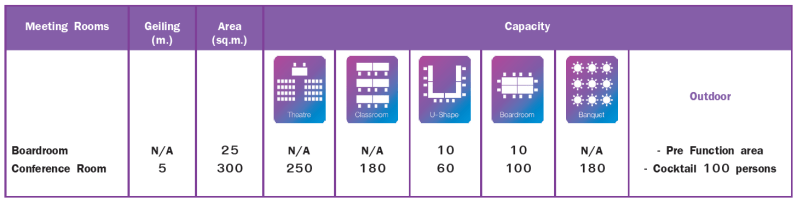 Syndicate rooms, Video equipment, Overhead projector, Air-conditioned meeting room