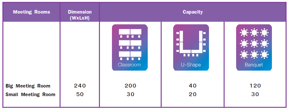 The room features an overhead Wi-Fi Projector with ceiling down screen, P.A. sound system, Wi-Fi internet & air-conditioning