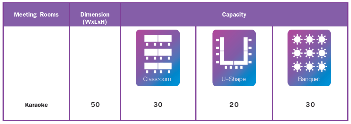 The room features an overhead Wi-Fi Projector with ceiling down screen, P.A. sound system, Wi-Fi internet & air-conditioning