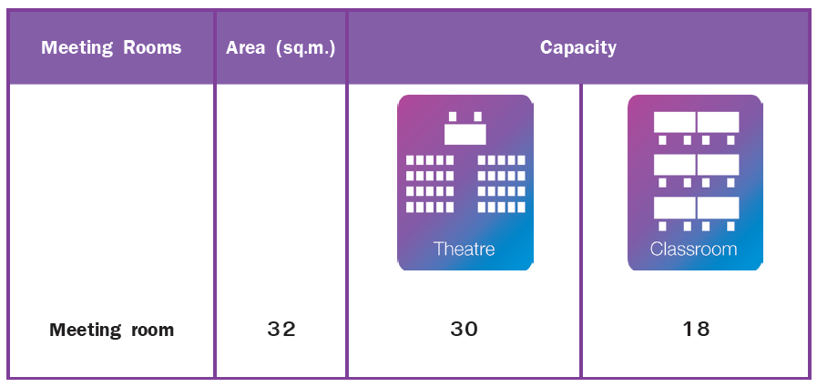 The room features an overhead Wi-Fi Projector with ceiling down screen, P.A. sound system, Wi-Fi internet & air-conditioning